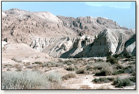This is where they found the dead sea scrolls. The cave is the dark area in-between the two shadows almost in the center of the photograph.